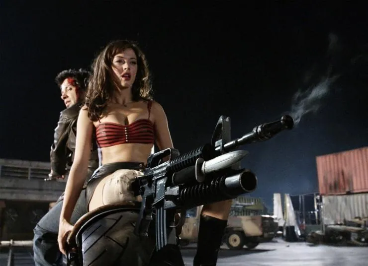 Фильм Планета страха 2007 раскрывает историю в сюжетной линии как Полиция техасского городка вынуждена иметь дело с жертвами смертельного вируса, превращающего людей в зомби. Народное ополчение возглавляет Черри с автоматом...